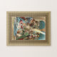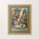 Vintage Malerei der Krippe mit Madonna und Kind, Joseph, drei weise Männer mit Geschenken, und Menschenmengen draußen, mit einem schönen Lichtstrahl auf den Babyjesus, der seine Hand in einem Gruß erhoben hat.