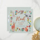 Die kleine Babyankündigung mit dustigem Grün mit niedlichen Waldtieren, Blume und Vögeln. Original-Kunstwerk von Caroline Bonne Müller
