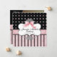 Die Geburtshinkunde besticht durch elegante französische Kopperplatten-Wirbel, rosa und grüne Punkte auf schwarzem Hintergrund, handgemalte, gepanzerte Stoffunterlage, einen Rahmen und einen wunderschönen handbemalten, rosa Seidenbogen. Alle aus originalen Kunstwerken von Audrey Jeanne Roberts. Das Ergebnis ist ein wunderbar zeitgenössisches Baby-Ensemble. Auf der Rückseite ist das gleiche Punktmuster und eine Klammer, die den Platz für das Foto Ihres Babys aufzeigt. Sie können ganz einfach ein eigenes Bild hinzufügen oder die Nachricht ändern. SIE KÖNNEN AUCH GENIESSEN: