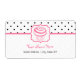 Ein Geburtstagsadressen-Aufkleber mit einem Hintergrund von kleinen schwarzen Polka-Punkten über weiß. Pink Trim. Rosa Kuchen im Innenrahmen oben in der Mitte. Personalisieren Sie den rosa und schwarzen Text über dem schieren Abschnitt unten. Suchen Sie nach passenden Einladungen in Jill's Paperie.