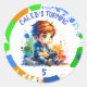 Geburtstagsaufkleber für Geburtstagsfeiern oder Gunst-Tasche. Niedlicher kleiner Anime-Junge, der Videospiele mit blauem, orangefarbenem und grünem Spritzer abspielt, der in einer Aquarellbild-Illustration erstellt wurde.