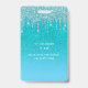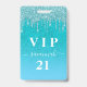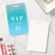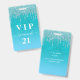 Ein modernes, stilvolles und glamouröses Abzeichen für eine 21. Geburtstagsfeier (oder jedes Alter). Ein aquamariner, grüner, blauer Farbverlauf Glitzer Hintergrund mit Imitate Glitzer Tropfen, Farbe Tropflook. Personalisieren und einen Namen hinzufügen. Der Name wird mit einem modernen handgeschriebenen Stilskript mit Swashes geschrieben. Der Text: VIP-Nummer 21. Um die Swashes behalten, löschen Sie nur den Beispielnamen, verlass die Leerzeichen oder Emoji's vor und nach dem Namen. Zurück: Ihre Party-Details.