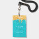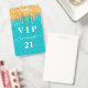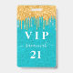 Ein modernes, stilvolles und glamouröses Abzeichen für eine 21. Geburtstagsfeier (oder jedes Alter). Ein aquamariner, grüner Glitzer Hintergrund mit Imitaten Gold Glitzer Tropfen, Farbe Tropfen aussehen. Personalisieren und einen Namen hinzufügen. Der Name wird mit einem modernen handgeschriebenen Stilskript mit Swashes geschrieben. Der Text: VIP-Nummer 21. Um die Swashes behalten, löschen Sie nur den Beispielnamen, verlass die Leerzeichen oder Emoji's vor und nach dem Namen. Zurück: Ihre Party-Details.