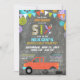 Mechanisches Thema mit Abhol-LKW und Reifen und farbenfrohe Banner, Werkzeuge, und Zahnräder und Zahnräder Hintergrund Druck-Design Geburtstagseinladungskarte.