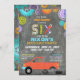 Mechanisches Thema mit Abhol-LKW und Reifen und farbenfrohe Banner, Werkzeuge, und Zahnräder und Zahnräder Hintergrund Druck-Design Geburtstagseinladungskarte.