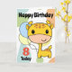 Niedliche Karte mit veränderbarem Alter und Vorlagen, um Ihre eigene Nachricht auf der Innenseite hinzuzufügen. Eine niedliche gelbe Giraffe mit braunen Flecken und einem fröhlichen Gesicht mit zwei pastellfarbenen Ballons. Oben liest glücklicher Geburtstag und das Alter zum links der Giraffe.