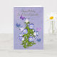 Passen Sie diese Geburtstagskarte für eine Patentante an, indem Sie die Vorlagen auf dem Cover und innen verwenden, um den Text zu ändern oder zu löschen. Vier farbenfrohe Schmetterlinge in Blau, lila und Rosa schweben um einen Strauß lila und weißer, glockenförmiger Blume. Der Hintergrund ist ein vermischtes Medium blau. Die Blätter um die Blume sind ein lebhaftes Grün. Die Blume werden von Za Za Scrap und Tubes und den Schmetterlingen von Pats Floral und Fauna modifiziert, beide von Digital Scrap Designs.