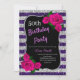 Eleganter lila und silberner Streifen Glitzer und rosa Rosen Geburtstagsfeier für Frauen jeden Alters. Das Alter kann für jedes Alter geändert werden. Text kann auf alles geändert werden, was zu Ihrer Veranstaltung passt. Schriftart, Schriftart und Text sind vollständig anpassbar! Papierform und -typ können an Ihr Budget und Ihren Geschmack angepasst werden!