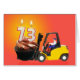 Eine Geburtstagskarte aus dem 73. Jahrhundert, die einen Gabelstapler mit einem riesigen Kuchen mit brennenden Kerzen auf der Oberseite zeigt.