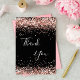 Ein weiblicher und eleganter Geburtstag Dankeschön Karte. Eine schwarze Hintergrundfarbe. Mit Rose Gold Konfetti. Auf der Vorderseite große Hand Schrift und der Text: Danke. Zurück: Personalisieren Sie Ihre Dankeschön Notiz und Name. Der Name ist mit einem modernen handgeschriebenen Stilskript geschrieben.