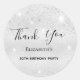 Ein Aufkleber für eine mädchenhafte und glamouröse 50. Geburtstagsparty (oder jedes Alter). Ein silbermetallicer Hintergrund mit eleganten Imitaten Glitzer Staub. Der Text: Vielen Dank ist geschrieben mit einem großen modernen handgeschriebenen Stil Skript. Personalisieren und fügen Sie einen Namen und Alter 50.