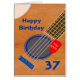 37. Geburtstagskarte für jemanden, der die Gitarre Liebe. Ein nahes Aufsetzen einer Gitarre mit einem Plectrum in den Saiten. Auf dem Spektrum sind die Worte 'You Rock'. Eine Geburtstagskarte für einen Musiker, der die Gitarre Liebe.
