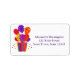 Ein festliches Adressetikett für Ihre nächste Geburtstagsfeier mit einem farbenfrohen, gestreiften Geburtstagsgeschenk und einem Ballon mit unterschiedlichen Mustern.