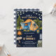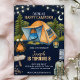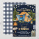 Geburtstagseinladung mit Camping-Thema. Ein Zelt steht unter Lichterketten mit einem Halbmond und Kiefern. Der Text lautet "Alle glücklichen Camper sind eingeladen! Joseph wird 8." Ein Lagerfeuer und eine Laterne sorgen für Wärme.