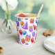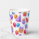 Ein buntes Geburtstagsfeier-Papierbecher-Muster mit Partyhüten, Luftballons und Cupcakes
