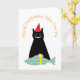 Glückliche Geburtstagskatze sitzt vor verpackten Fischen.