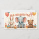 Ein zauberhaftes Geburtstagsmotiv mit einem fröhlichen Elefanten, einem niedlichen Hasen und einem lachenden Bären - umgeben von Ballons, Cupcakes und Konfetti. Dieses Bild die freundliches Magie und Freundschaft.
