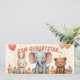 Ein zauberhaftes Geburtstagsmotiv mit einem fröhlichen Elefanten, einem niedlichen Hasen und einem lachenden Bären - umgeben von Ballons, Cupcakes und Konfetti. Dieses Bild die freundliches Magie und Freundschaft.