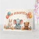 Ein zauberhaftes Geburtstagsmotiv mit einem fröhlichen Elefanten, einem niedlichen Hasen und einem lachenden Bären - umgeben von Ballons, Cupcakes und Konfetti. Dieses Bild die freundliches Magie und Freundschaft.
