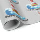 Rot-weiß gestreiftes Leuchtturm mit blauer Welle, Happy Birthday Text und Möwen auf grauem Hintergrund. Die Hintergrundfarbe kann geändert werden.