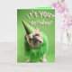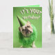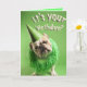 niedlicher Bulldogge, ganz in einem grünen Party gekleidet, der eine tolle Geburtstagskarte macht, auch wenn man keinen Bulldoten besitzt