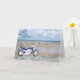 Ein blaues Motorrad stehend an einem Strand mit flauschigen Wolken am Himmel. Glücklicher Geburtstag geschrieben in Gestein reflektiert in dem Wasser auf dem Sand.