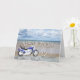Ein blauer Motorrad stehend auf einem Strand mit flauschigen Wolken am Himmel. Alles Gute zum Geburtstag geschrieben in Stein reflektiert im Wasser auf dem Sand.