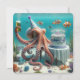 Ein Oktopus mit einem Party, das ein Bier hält und neben einem Geburtstagskuchen unter Wasser sitzt. Alle Texte können geändert werden.