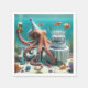 Ein Oktopus mit einem Party, das ein Bier hält und neben einem Geburtstagskuchen unter Wasser sitzt.