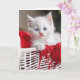 Niedliches, weißes Kätzchen in einem Korbkorb und gezogenes rotes Garn zum Geburtstag. Inside text ist bearbeitbar.