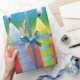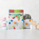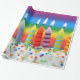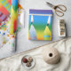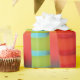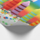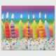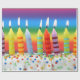 Geburtstagskuchen und farbenfrohe Kerzen auf dem Umschlagpapier