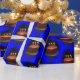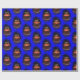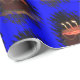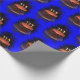 Ein Foto eines Geburtstagskuchen-Papiers, das hell und farbenfroh ist. Mit einem blauen Rahmen um einen Kuchen mit drei brennenden Kerzen. Das ist PAPIER.