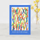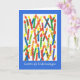 Eine Birthday Card mit Kerzen in leuchtenden Farben und "Happy Birthday" auf Schwedisch, aus einer handbemalten Papiertüte von Judy Adamson. Die Innenseite wird für Ihre eigene Nachricht leer verlassen.