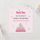 Ein hübscher, weichrosa Hintergrund mit einem bunten Geburtstagskuchen mit Sternkerzen. Kleine grüne und rosa Sterne schwebend auf dem Hintergrund. Passen Sie Ihre Party-Informationen nach Ihren Wünschen an. Ideal für Kinder oder Erwachsene.