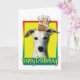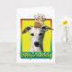 Feiern Sie einen Geburtstag mit dieser whimsical Whippet Hund Grußkarte. Mit einem Kuchen auf dem Kopf wird dieses Design sicher ein Lächeln und ein Giggles bringen! BTW, Dieses Design hat mehrere Versionen, mit verschiedenen Hintergrundfarben. Es gibt auch eine Einladung zu einer Party-Version.