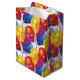 Die Papiergeschenktasche ist in weißer Farbe mit glänzender Optik und einem farbenfrohen Geburtstagsballondruck zu sehen.
