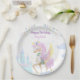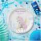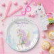 Geburtstagsparty-Teller mit einem bezaubernden Einhorn mit Flügeln, umgeben von niedlichen Bildern einer magischen Burg, Wolken und festlichen Bollwerk.