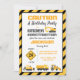 Niedlich im Bau Geburtstagsfeier Einladung. Gelb, weiß, schwarz und grau mit Baukastenmuster, Vorsichtszeichen und Konstruktionskeulenmuster.