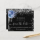 Eine trendige und mädchenhafte Save the Date-Karte für eine 50. Geburtstagsfeier (oder jedes Alter). Ein klassischer schwarzer Hintergrund mit Imitaten, silberfarbenem Glitzer und blauen Blumen. Personalisieren und fügen Sie Datum und Name/Alter hinzu. Der Text: Save the Date ist mit einem großen angesagten, handgeschriebenen Stilskript geschrieben.