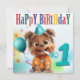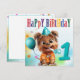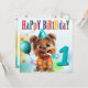 Niedlich Terrier in Party Hut mit Horn, feiert einen Geburtstag.