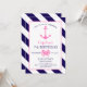Eine nautische Geburtstagseinladung mit einer Abbildung einer rosa Krabbe und eines Ankeres. Hintergrund ist blau-weiß diagonale Streifen. Gegenüber ist die Seite gestreift. Suchen Sie in Jill's Paperie nach koordinierenden Artikeln.
