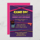 Eine lustige Laser Tag Einladung, die heißt Game On! Neonfarben, Laserstrahlen, Phaserpistole und Westen werden dargestellt. Das lila und rosa Thema macht es besonders gürmisch. Personalisieren Sie diese Einladung für die Geburtstagsparty eines Mädchens.