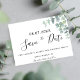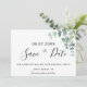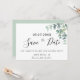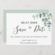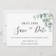 Eine moderne Rette die Karte für eine 50. Geburtstagsfeier (oder jedes Alter). Ein schick weißer Hintergrund mit grünem, wasserfarbenem Eukalyptusgrün, Blätter und Zierpflanzen. Personalisieren und fügen Sie ein Datum und Name/Alter 50 und den Ort des Veranstaltungsortes. Schwarze Buchstaben. Der Text: Save the Date ist mit einem großen angesagten, handgeschriebenen Stilskript geschrieben. Zurück: grüne Hintergrundfarbe.