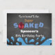 Lass ihnen, dass es Zeit ist, Spaß zu haben und nass zu werden.  Eine lustige Geburtstagsfeier mit Wasserspritzen und der Nachricht "You're Invited to Get Super Soaked" Name und Alter hinzufügen.  Die Rückseite hat coole blaue und schwarze Streifen mit einer Linie für die Anpassung.