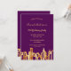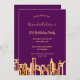 Eine Einladung für eine elegante 21. Geburtstagsfeier (oder jedes Alter) für sie, Frauen. Ein eleganter, lila Hintergrund mit Imitaten vergoldeten City Skyline als Dekoration. Der Text: Der Name wird mit einem goldenen, modernen Handschrift geschrieben. Vorlage für Name und Party.