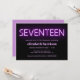 Coole moderne 17. Geburtstagsfeier mit "siebzehn" in lila leuchtenden Neonleuchten auf schwarzem Hintergrund.
