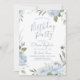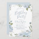 Moderne Kalligraphie Geburtstagsgeschichten, umgeben von hübschen Aquarellblumen in staubblau und schlauer grün, großartige elegante Geburtstagseinladungen.