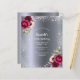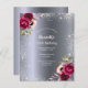 Im Vordergrund: Eine Einladung zu einer 50. Geburtstagsfeier. Ein dunkles Imitat silber metallisch aussehender Hintergrund. Die Einrichtung ist mit lila und bordeauxfarbenen Blume in Rosa und Rose geschmückt. Vorlagen für einen Namen und Party Details. Der Name wird mit einem handgeschriebenen Stil geschrieben, hellgraue Buchstaben. Ideal für ein Party im Winter!