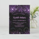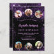 Eine mädchenhafte und weibliche 21. (oder jedes Alter) Geburtstagsfeier Einladung. vorne: Ein schicker schwarzer Hintergrund. Dekoriert mit dunklen lila Imitaten Glitzer Staub. Personalisieren und fügen Sie einen Namen, Party-Details und 6 Fotos. Der Name wird mit einem handgeschriebenen Stilskript geschrieben, mit lila, hellen Buchstaben. Zurück: Schwarzer Hintergrund und Imitat Glitzer.