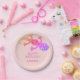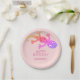 Gecko Geburtstagszeitung Teller für Kinder. Die Teller haben einen niedlichen Gecko. Rainbow Geccko ist besonders für Mädchen geeignet. Der Hintergrund ist rosa. Personalisierbare Teller mit einem guten Geburtstagstext und einem Kindernamen. Personalisieren Sie die Teller einfach. Der Text ist in rosa. Ideal für eine Geburtstagsfeier von Jungen oder Mädchen.